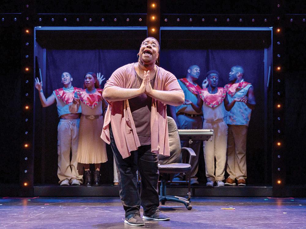 Kai Clifton (center) as Usher and the company of "A Strange Loop" at Calderwood Pavilion. Photo courtesy of Maggie Hall Photography.