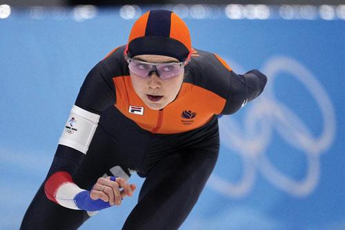 Sanne In 't Hof of the Netherlands competes in the women's speedskating 5,000-meter race at the 2022 Winter Olympics, Thursday, Feb. 10, 2022, in Beijing. On Twitter, the speedskater blocked, unblocked and then blocked again a Uyghur living in t  (Source: AP Photo/Sue Ogrocki, File)