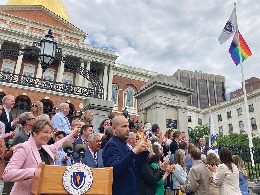Standing on the Statehouse steps, Healey said she was reminded of all who paved the way for the court decision in Massachusetts that legalized same-sex marriage. She also said that the right to marry and other victories for the LGBTQ community must be defended against ongoing threats.