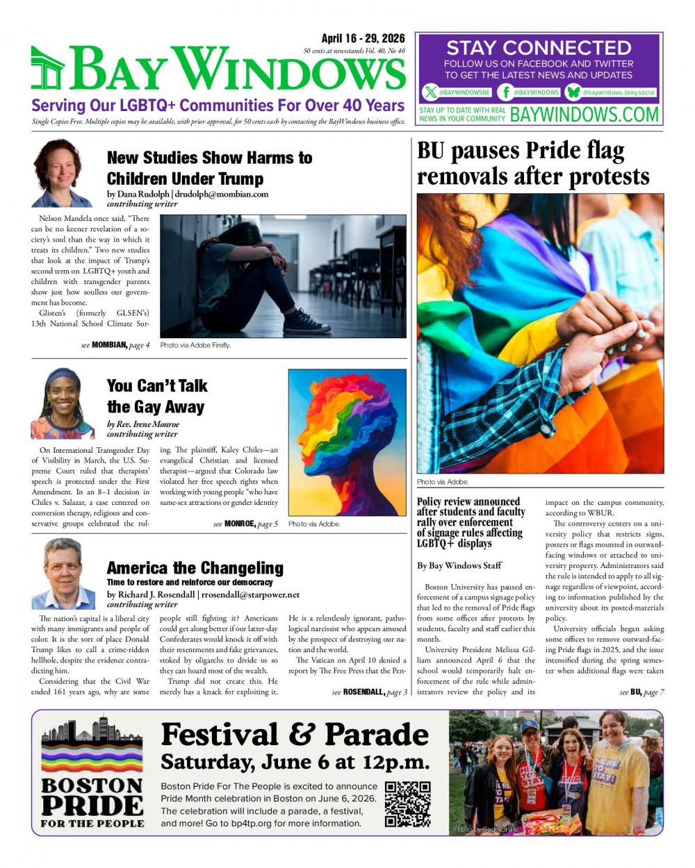 Boston Pride for the People — Parade, Festival & Block Party | Sat, June 6 | 11 AM—8 PM Boston Pride for the People | Copley Square to Boston Common, Boston New England's largest Pride event. Parade steps off at 11 AM from Copley Square through the South End and Back Bay to Boston Common. All-ages festival noon—6 PM. Block party 2—8 PM. Free to attend. bostonprideforthepeople.org | [email protected]